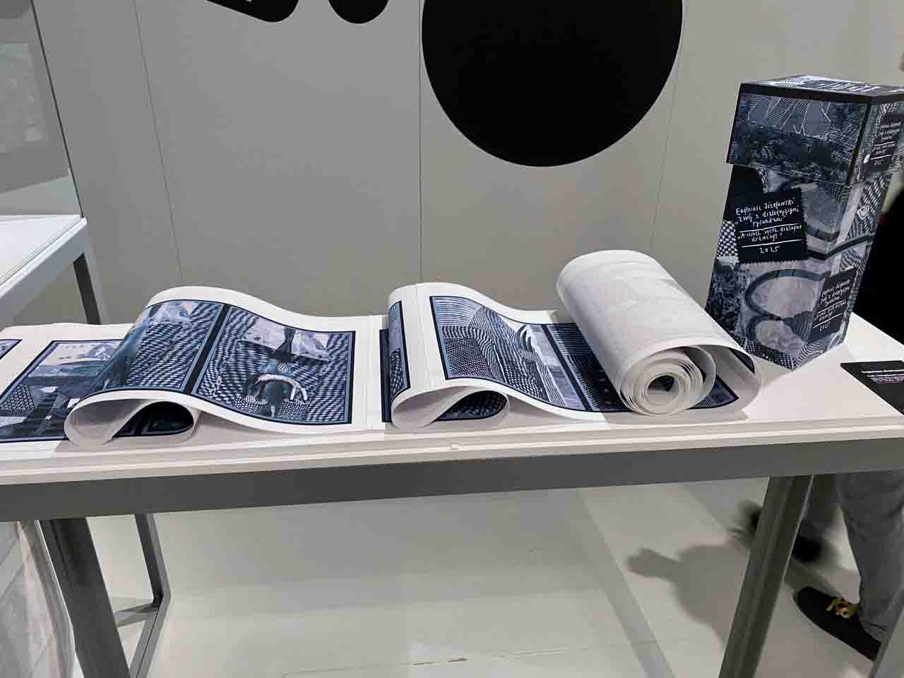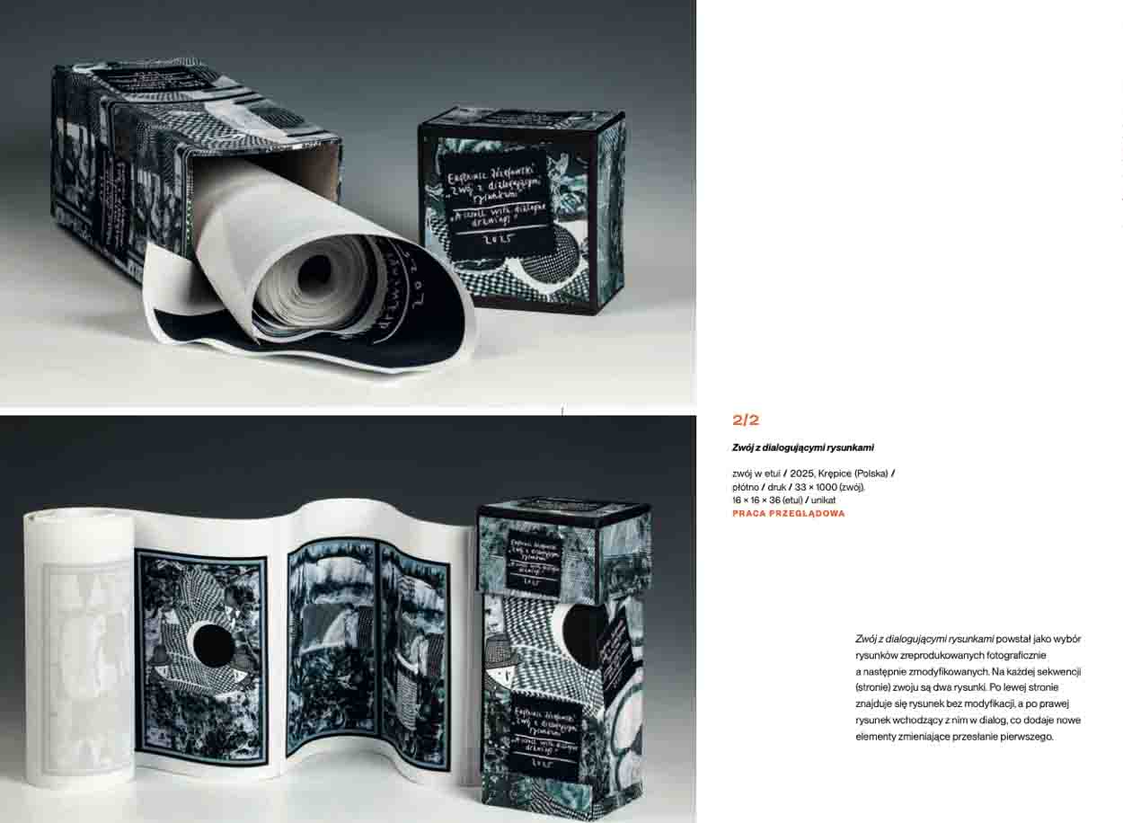 „Zwój z dialogującymi rysunkami” ma formę długiego, zwijanego pasa papieru umieszczonego w pudełku–etui. Na każdej sekwencji zwoju artysta zestawia dwa rysunki: po lewej stronie oryginalną kompozycję, po prawej – jej przetworzenie, które wchodzi z nią w dialog. Dodane elementy przekształcają znaczenie pierwszego obrazu, prowokując widza do porównywania, śledzenia różnic i samodzielnego dopowiadania historii. Zwój czytany jest w czasie – rozwijanie i zwijanie staje się integralną częścią odbioru, a ruch ręki zamienia się w gest współtworzenia opowieści.